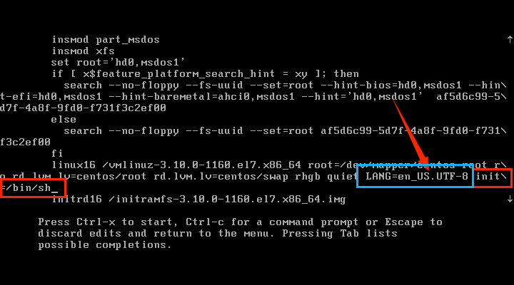 在后面输入init=/bin/sh,注:先打个空格在输入,紧接着按CTRL+x
